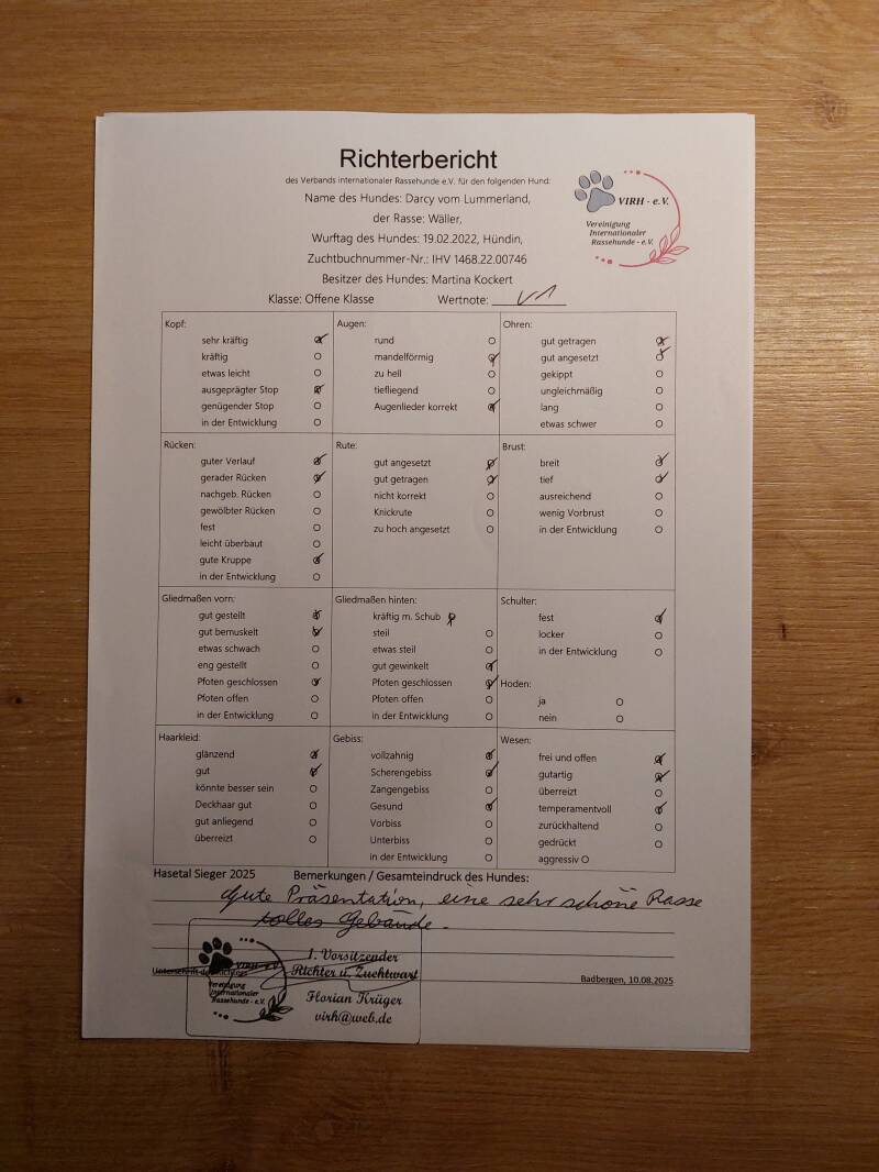 Auch wenn der Wäller nicht vorrangig über das äußere Erscheinungsbild definiert wird, haben wir Darcy auf einer Zuchtausstellung unseres Zuchtvereins, dem VIRH - e.V. vorgestellt. Und um es vorab kurz auf den Punkt zu bringen: wir fanden es sehr schön, wieviele Komplimente wir für unsere hübsche Darcy mit ihrem tollen Auftreten und Wesen bekommen haben, sowohl von anderen Hundebesitzern, Teilnehmern der Show als auch von den ZuchtrichterInnen. Darcy hat in allen Prüfungen von den Richtern ein "vorzüglich 1" bekommen, war dann im Endring der Klasse aller Hunde über 45 cm auf dem ersten Platz und hat im Endring aller Hunde der Ausstelung einen tollen zweiten Platz "best of show" erhalten. Zudem hat sie den Titel "Nationaler Champion" errungen. Auch wenn der Augenmerk bei der Zucht der Wäller auf gesunden und wesensfesten Hunden und nicht vorrangig auf dem äußeren Erscheinungsbild liegt, war es doch mal schön, diese Rückmeldungen zu erhalten. Für die, die es interessiert: untenstehend die einzelnen Richterberichte der Prüfungen zum Anschauen.
