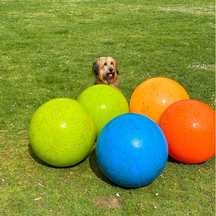 Jede Woche trainiert Darcy mit Tina in der Hundeschule "Dog Scout" bei Birgit Böttcher in Haltern am See voll Begeisterung Treibball. Diese spannende und vielseitige Hundesportart wurde von Jan Nijboer ursprünglich als Beschäftigung für Hütehunde entwickelt und bietet sowohl körperliche als auch geistige Auslastung. Das Ziel: Der Hund lernt nach Kommando seines Menschen bunte Gymnastikbälle gezielt in ein vom Hundeführer gekennzeichnetes "Tor" zu treiben. Auf dieser Art stärkt Treibball die Kommunikation und die Bindung zwischen Mensch und Hund und fördert gleichzeitig die Konzentration. Darcy ist hier mit vollem Elan und Körpereinsatz dabei, denkt super mit, kann sich gut fokussieren. Wenn es nach Darcy ginge, würde sie jeden Tag Treibballtraining machen....