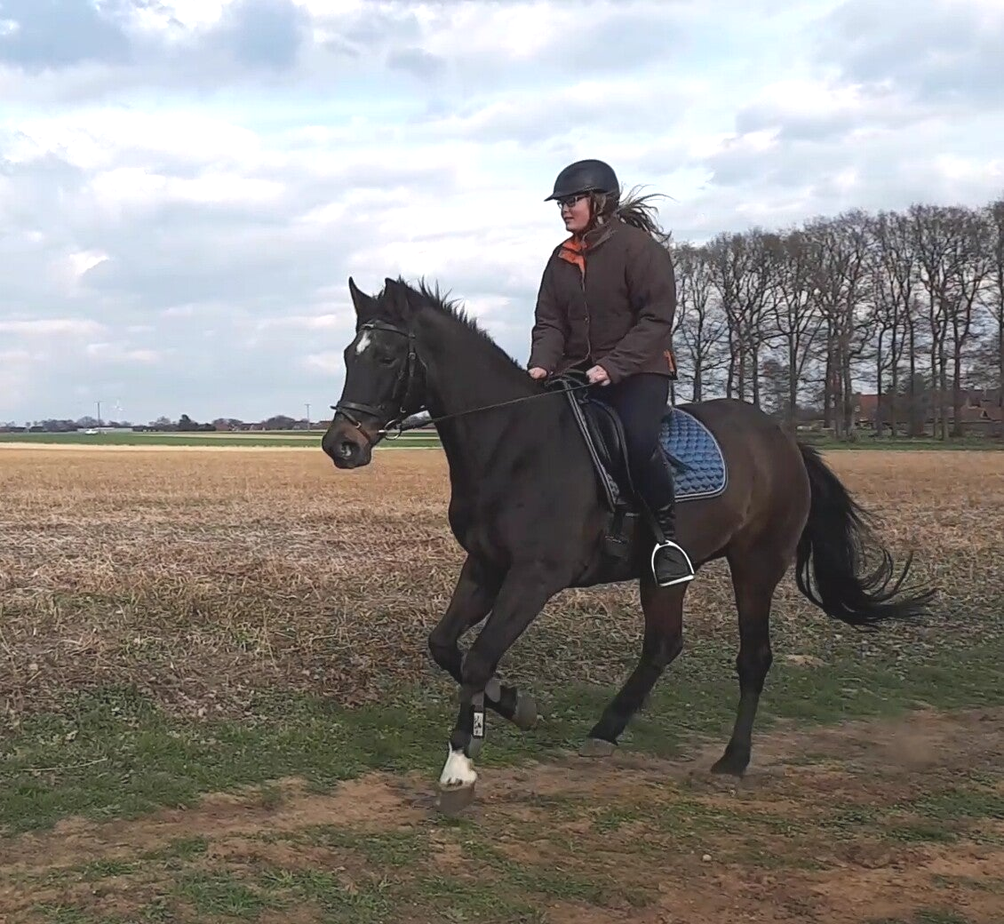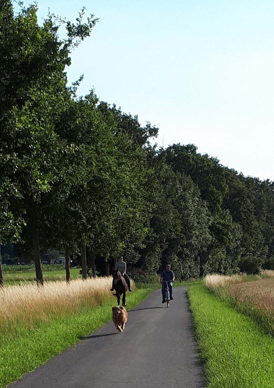 Doch nicht nur unsere Hunde haben unser Leben bereichert: 29 Jahre lang war auch unsere Westfalenstute Ulana ein wichtiger Teil unserer Familie. Als Fohlen gekauft, von uns großgezogen und ausgebildet, hat Ulana nicht nur unsere Familie begleitet, sondern verschiedenste Rollen gefüllt: als Schmusetier, Voltipferd, Kleinkindreitpferd, Therapiepferd, Turnierpferd und zuverlässige Partnerin für Ausritte durch das schöne Münsterland. Besonders Joda begleitete Tina und später auch Lea oft am Pferd. Als Darcy zu uns kam, war Ulana bereits Rentnerin, doch sie genoss noch gemütliche Spaziergänge, bei denen Darcy gerne dabei war.